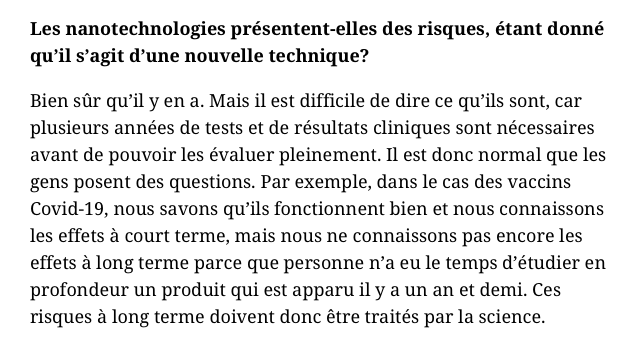 Ces risques à long terme doivent être traités par la science, nous dit Madame. Ce qui équivaut à dire on ne peut plus clairement que ces “produits“ (que l’on savait pertinemment être hautement toxiques) n’ont jamais été prouvés inoffensifs, ni sains, ni porteurs d’aucun effet bénéfique, quel qu’il soit. L’expérimentation ayant lieu en ce moment, en direct, dans le monde entier, depuis le mois de janvier 2021.