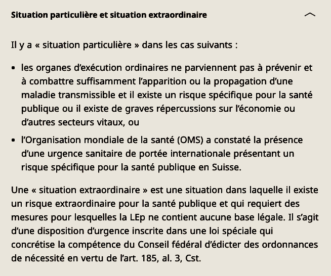 Une « situation extraordinaire » est une situation dans laquelle il existe un risque extraordinaire pour la santé publique et qui requiert des mesures pour lesquelles la LEp ne contient aucune base légale. Il s’agit d’une disposition d’urgence inscrite dans une loi spéciale qui concrétise la compétence du Conseil fédéral d’édicter des ordonnances de nécessité en vertu de l’art. 185, al. 3, Cst. “