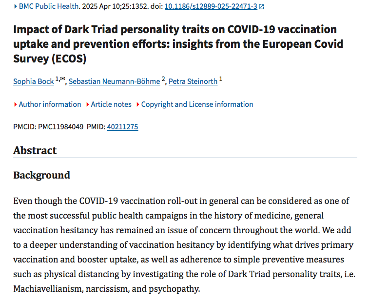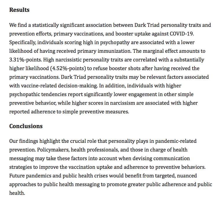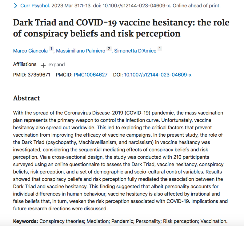 Cette étude voudrait donc expliquer et même convaincre que le fait de rester sain d’esprit et de faire preuve d’honnêteté intellectuelle, scientifique et médicale, est en fait un trouble de la personnalité appelé “Dark Triad“, soutenu et renforcé par une mentalité dite conspirationniste.