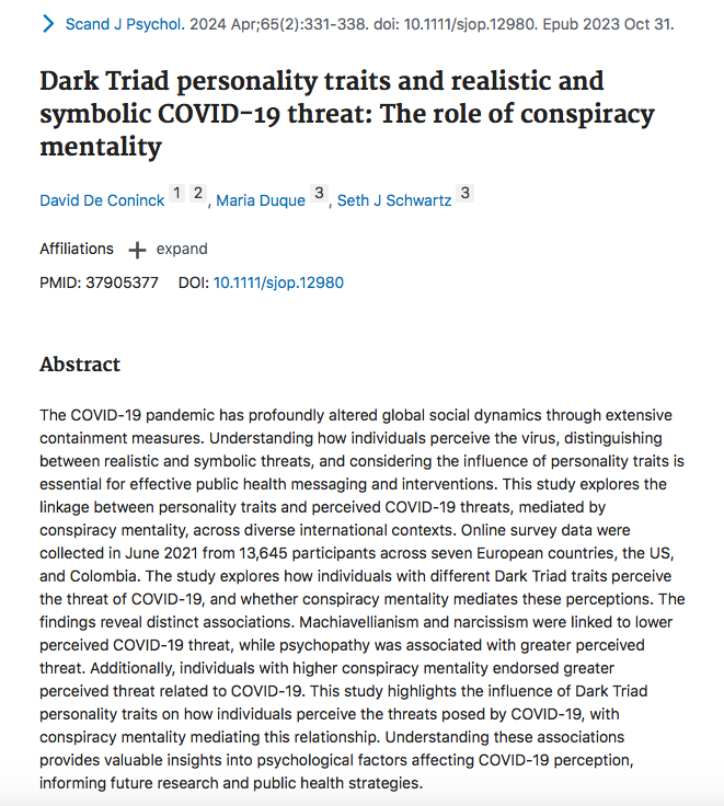 “ This study highlights the influence of Dark Triad personality traits on how individuals perceive the threats posed by COVID-19, with conspiracy mentality mediating this relationship. “